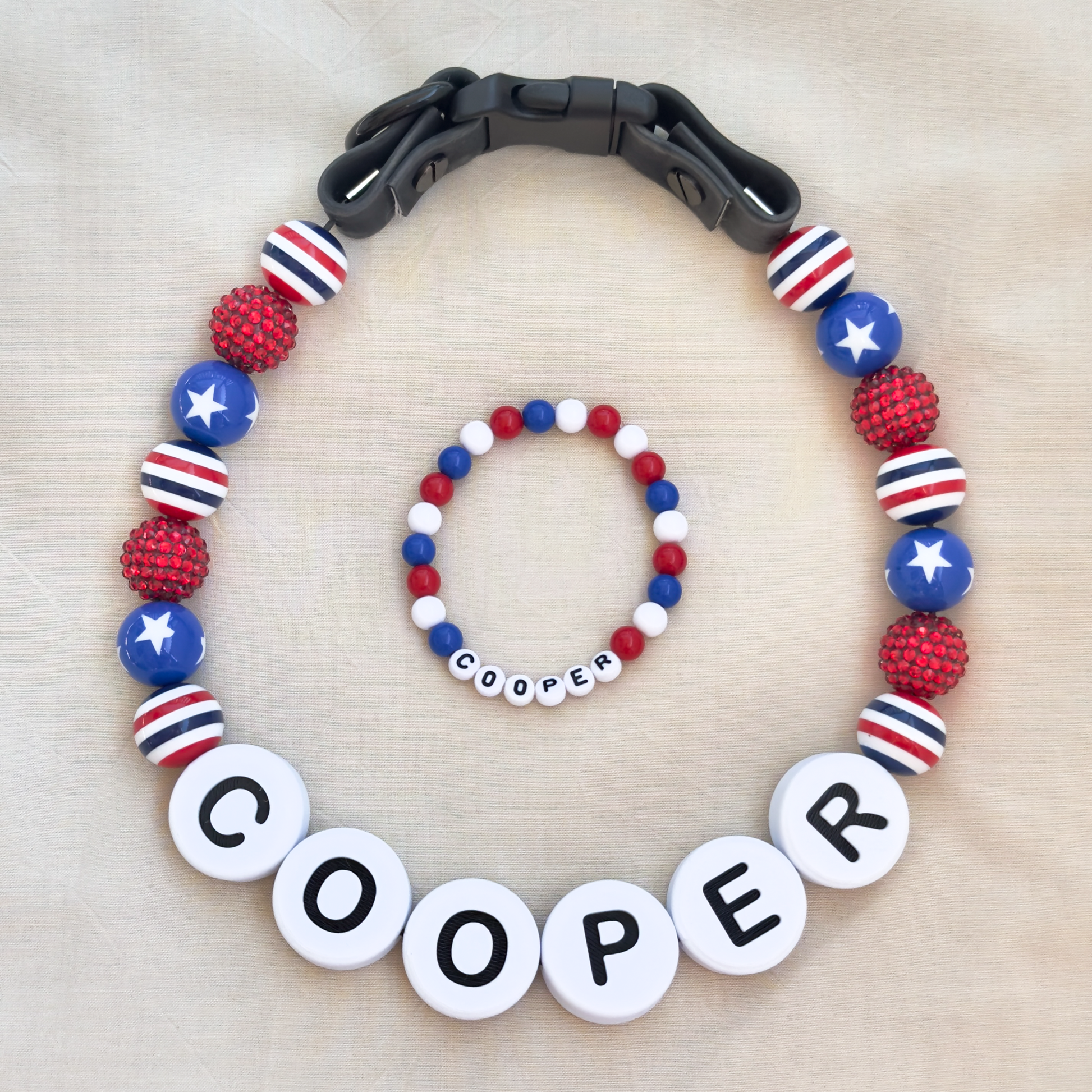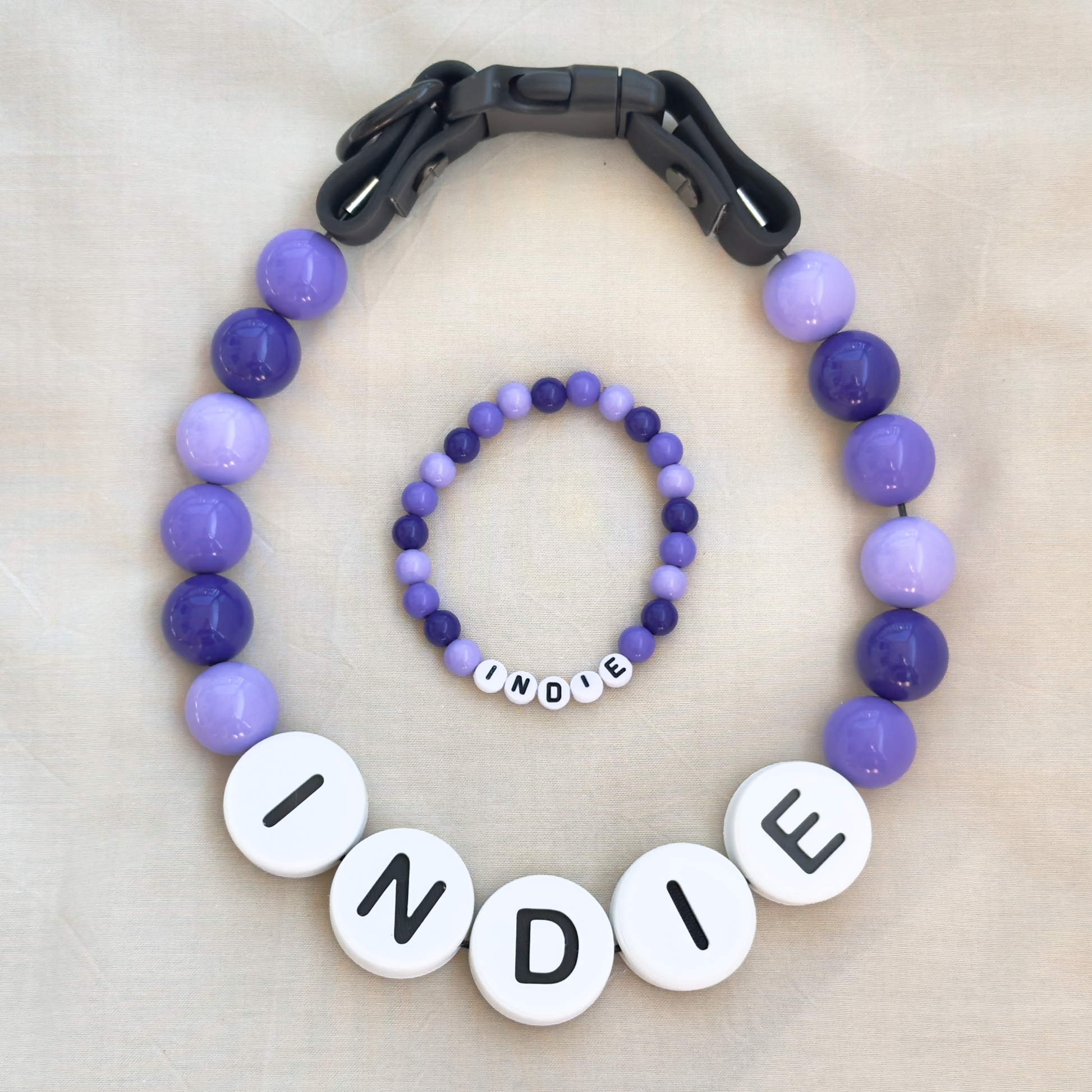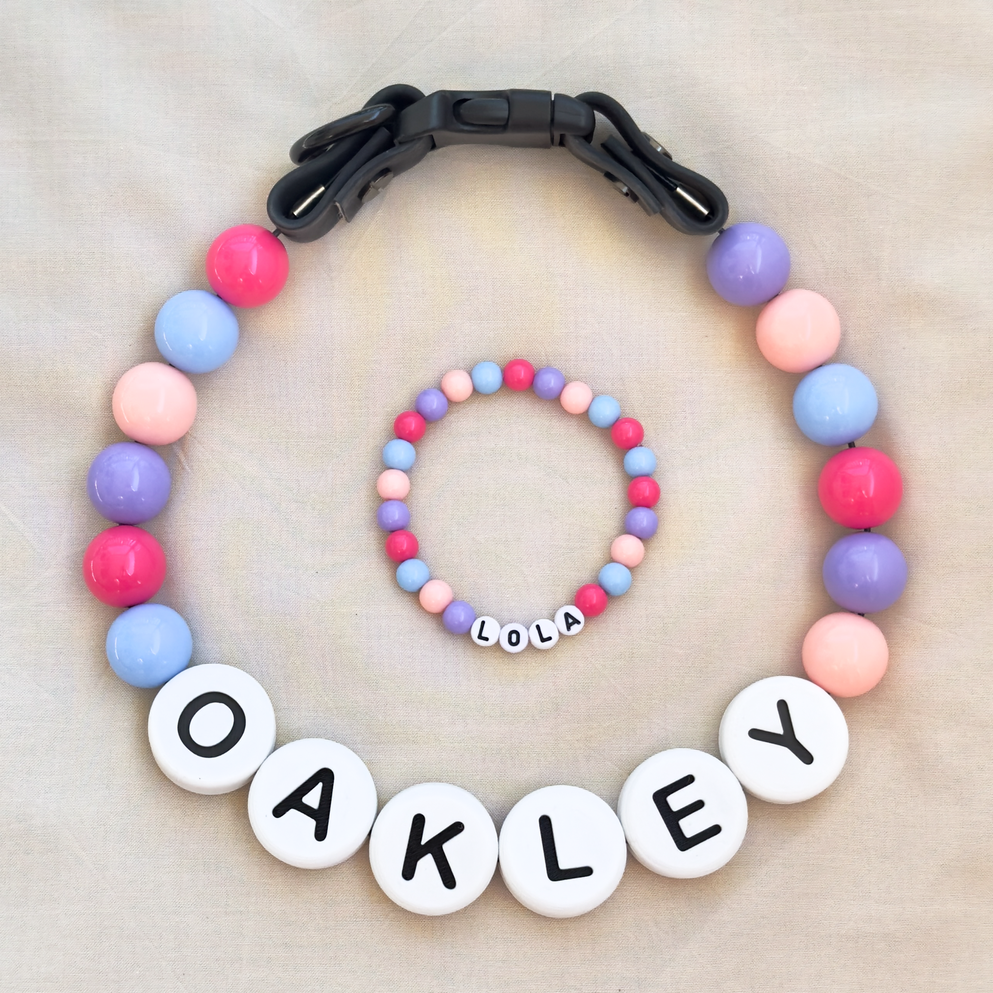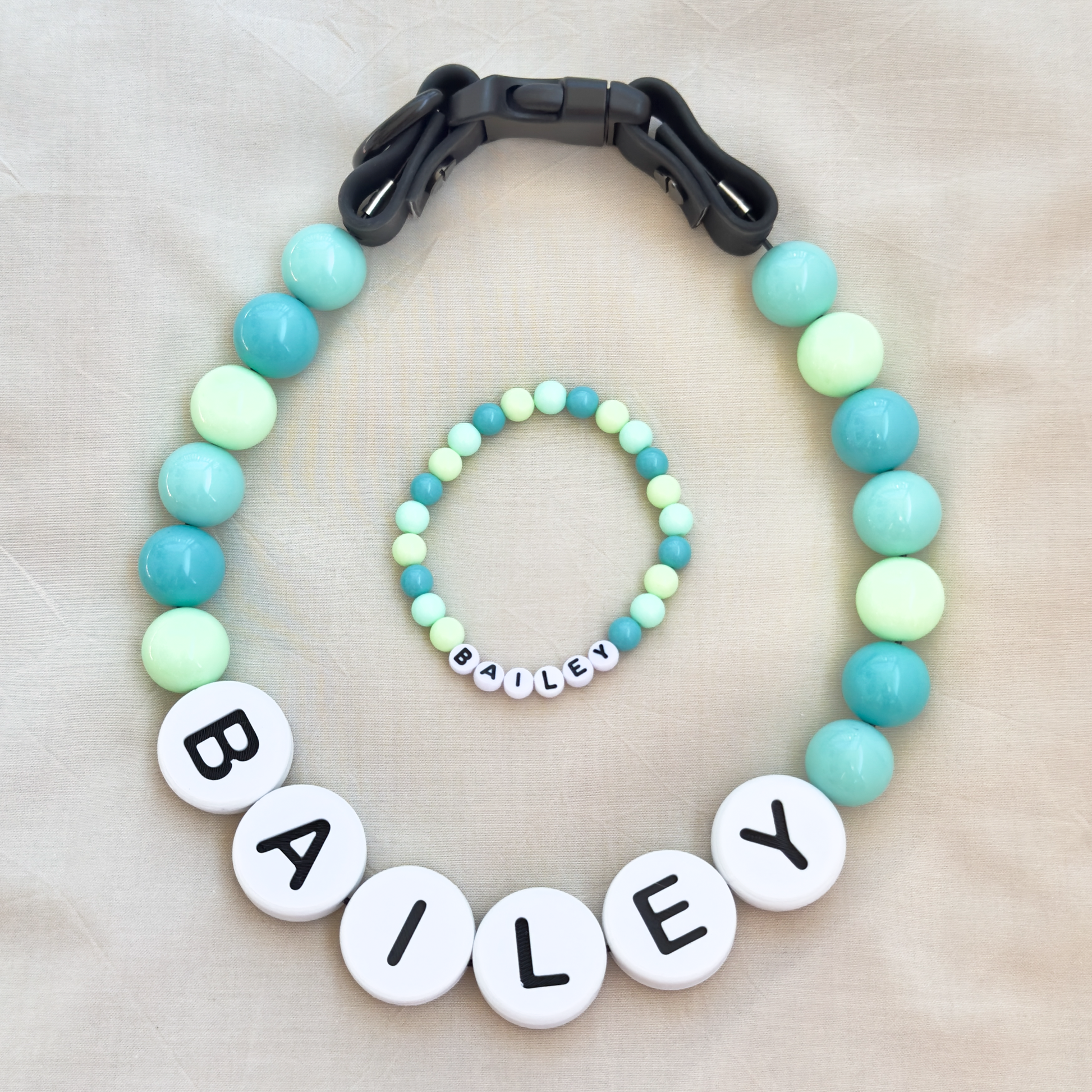 Crafted with a biothane strap, stainless steel cable, metal D-ring, and a mix of acrylic and letter beads, this collar features a sturdy side-release buckle for secure, comfortable wear—and can be fully customized with your pet’s name and your choice of colors in the customization section.