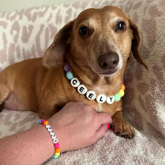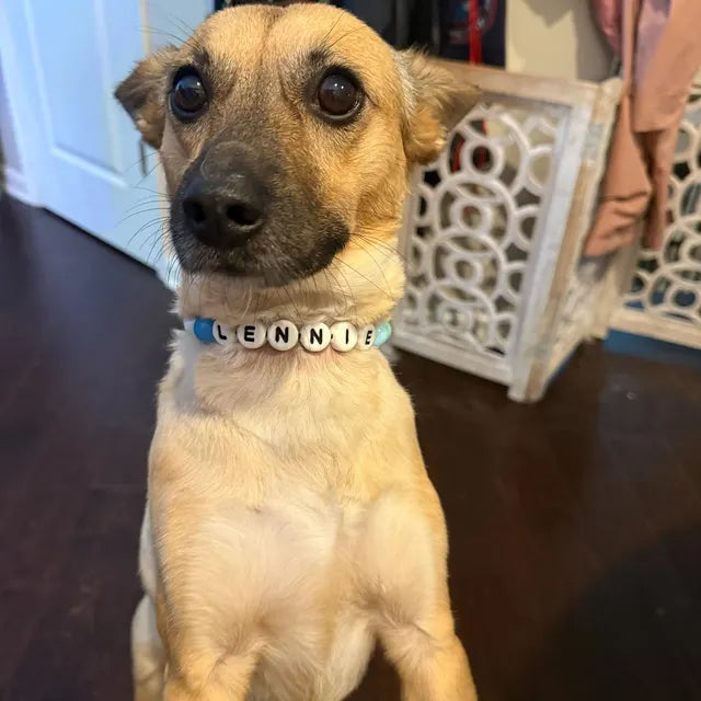 Materials: Biothane strap, metal D-ring, stainless steel cable, acrylic beads, and varying sizes of letter beads.